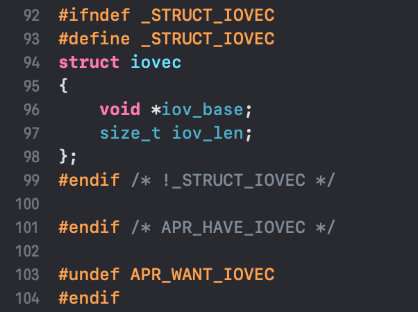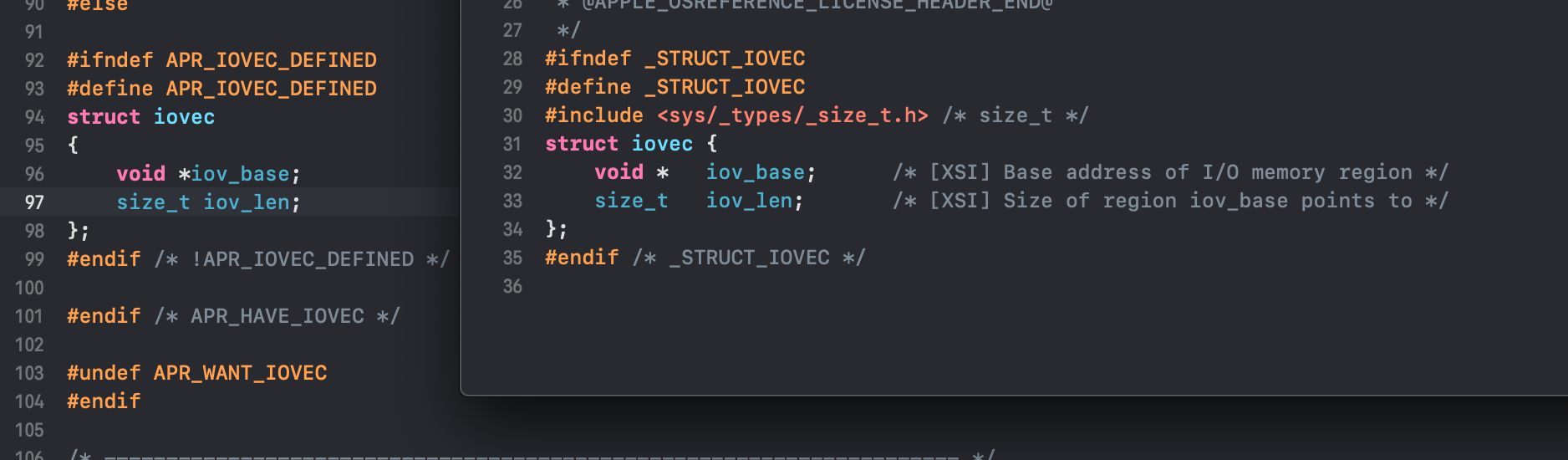 xcode 라이브러리에도 iovec 구조체가 있고, api 쪽에도 동일 이름의 구조체가 있다.