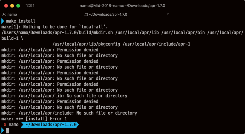 라이브러리를 /usr/local/apr 로 복사를 하려고 하는 데 권한 문제가 있다.