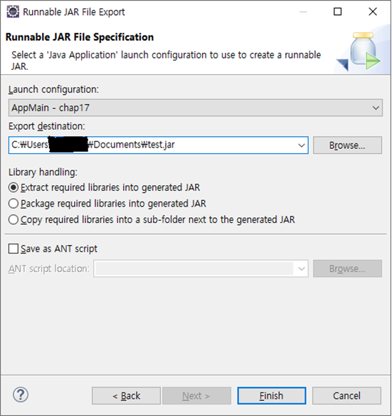 만들어진 jar 파일의 압축을 풀어보면 MANIFEST.MF 파일이 들어있고 만약 Launch configuration으로 main 함수가 있는 클래스가 지정이 되어 있다면 MANIFEST.MF 파일에 Main-Class 및 Class-Path 부분의 값이 지정된다.