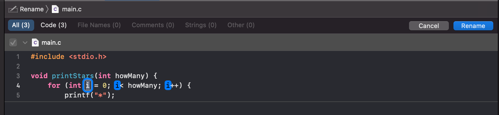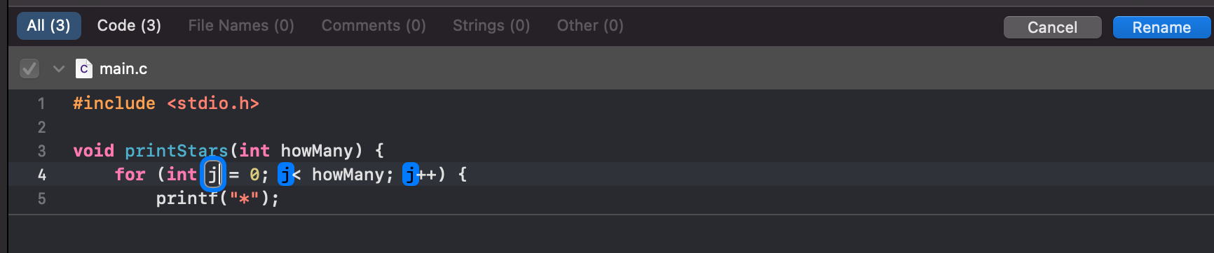 (참고로 printStars 라는 함수는 호출하는 main 함수보다 위에 있어야 됩니다. 아래에 있다면 컴파일 에러가 나올 수 있습니다.)