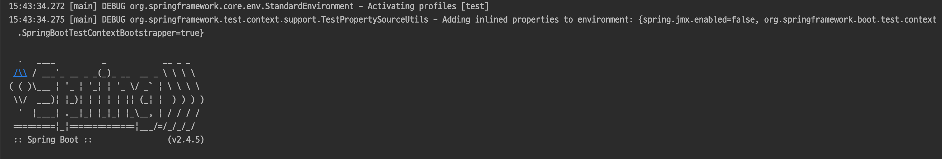 다만 좀 이상한점은 @SpringBootTest 의 경우 스프링 컨텍스트가 올라오는 로그가 보여야 하는데 그런 것 없이 달랑 assert만 수행된 것이다.