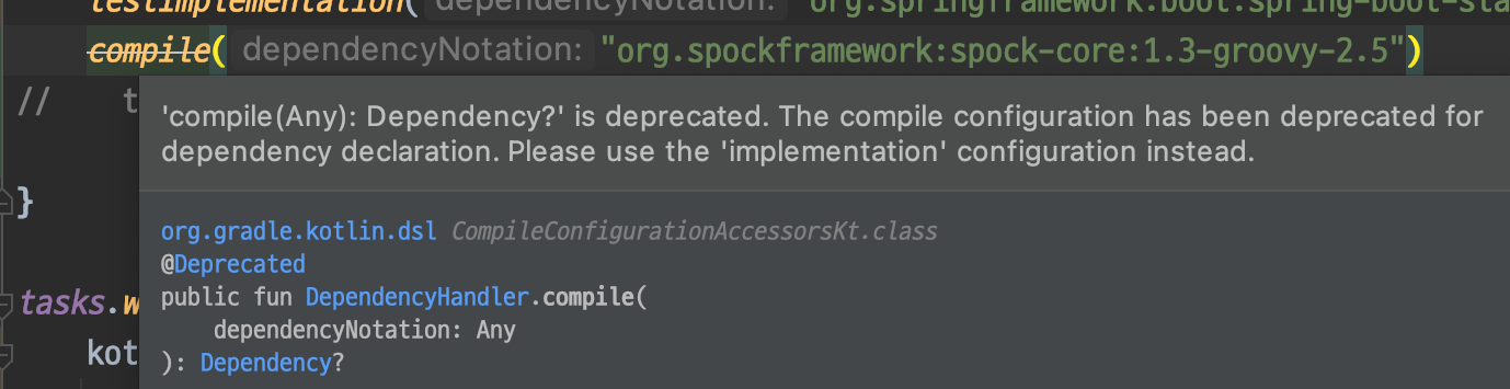 Groovy 2.5를 사용하는 경우에 아래와 같은 경고가 떠서 뭔가 아쉬운 느낌이 든다.