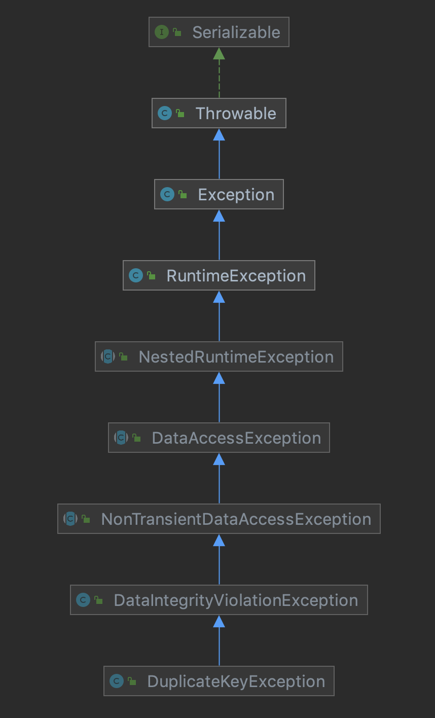 클래스의 계층 구조를 살펴보면 DuplicateKeyException의 부모 클래스가 DataIntegrityViolationException 임을 알 수 있다.