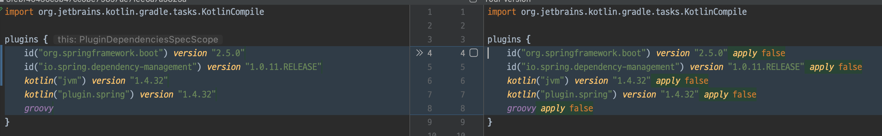 kotlin("plugin.spring") version "1.4.32" apply false