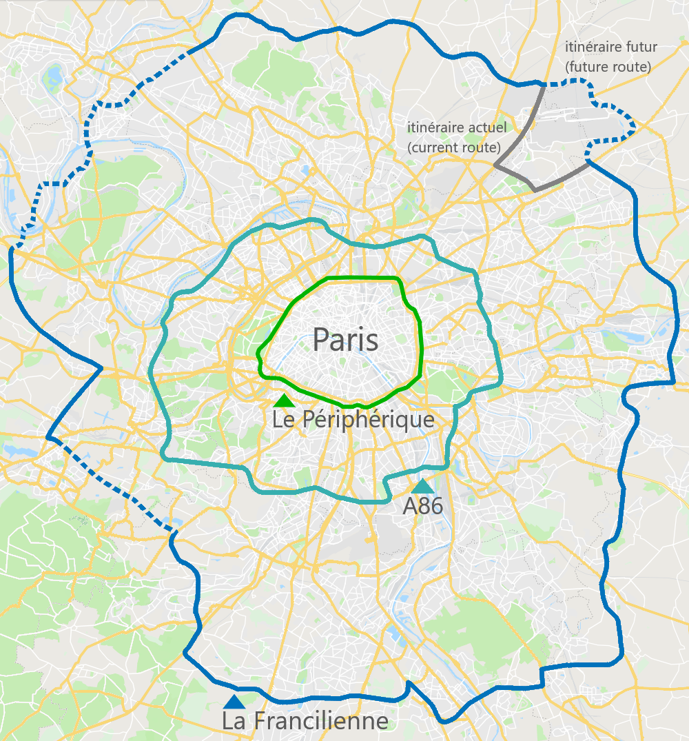 지도를 찾아보니 A86이나 La Francilienne 와 같은 더 많은 외곽순환 도로가 경계(boundary)를 나누고 있다는 것을 알게 되었다.