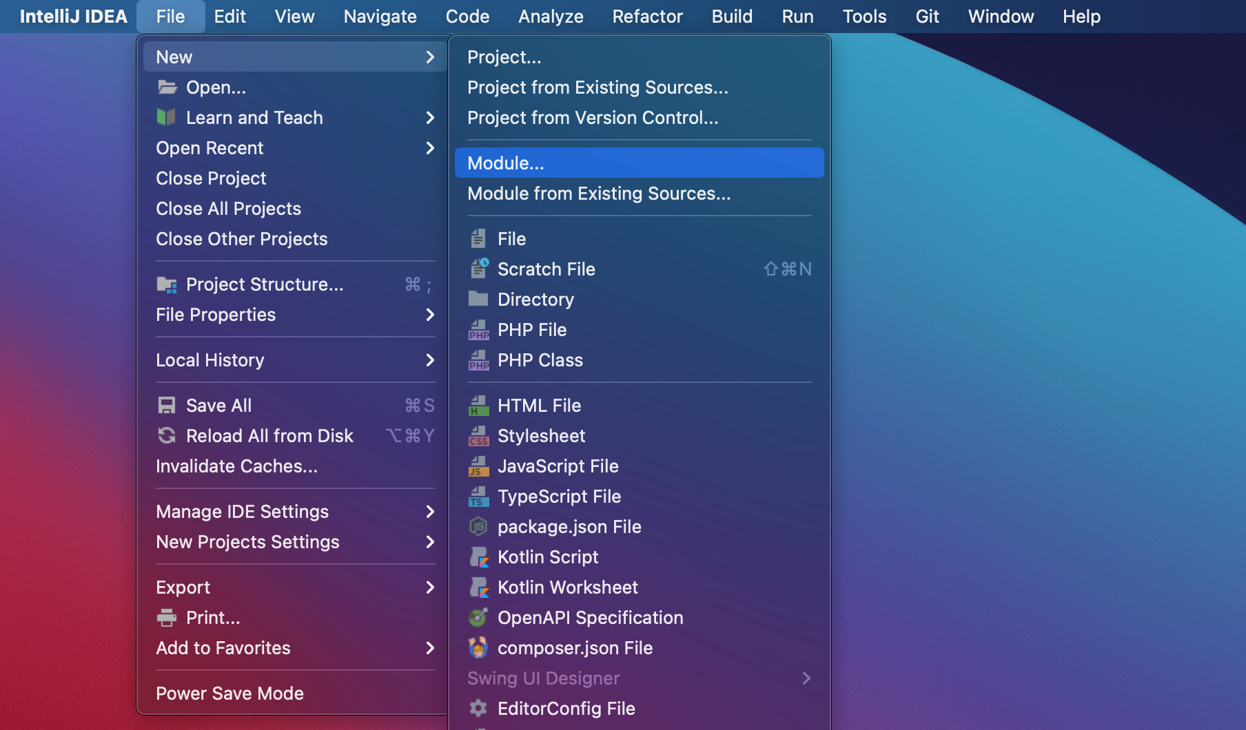 단일 모듈로 되어 있는 프로젝트를 열고, File > Module... 을 선택한다.
