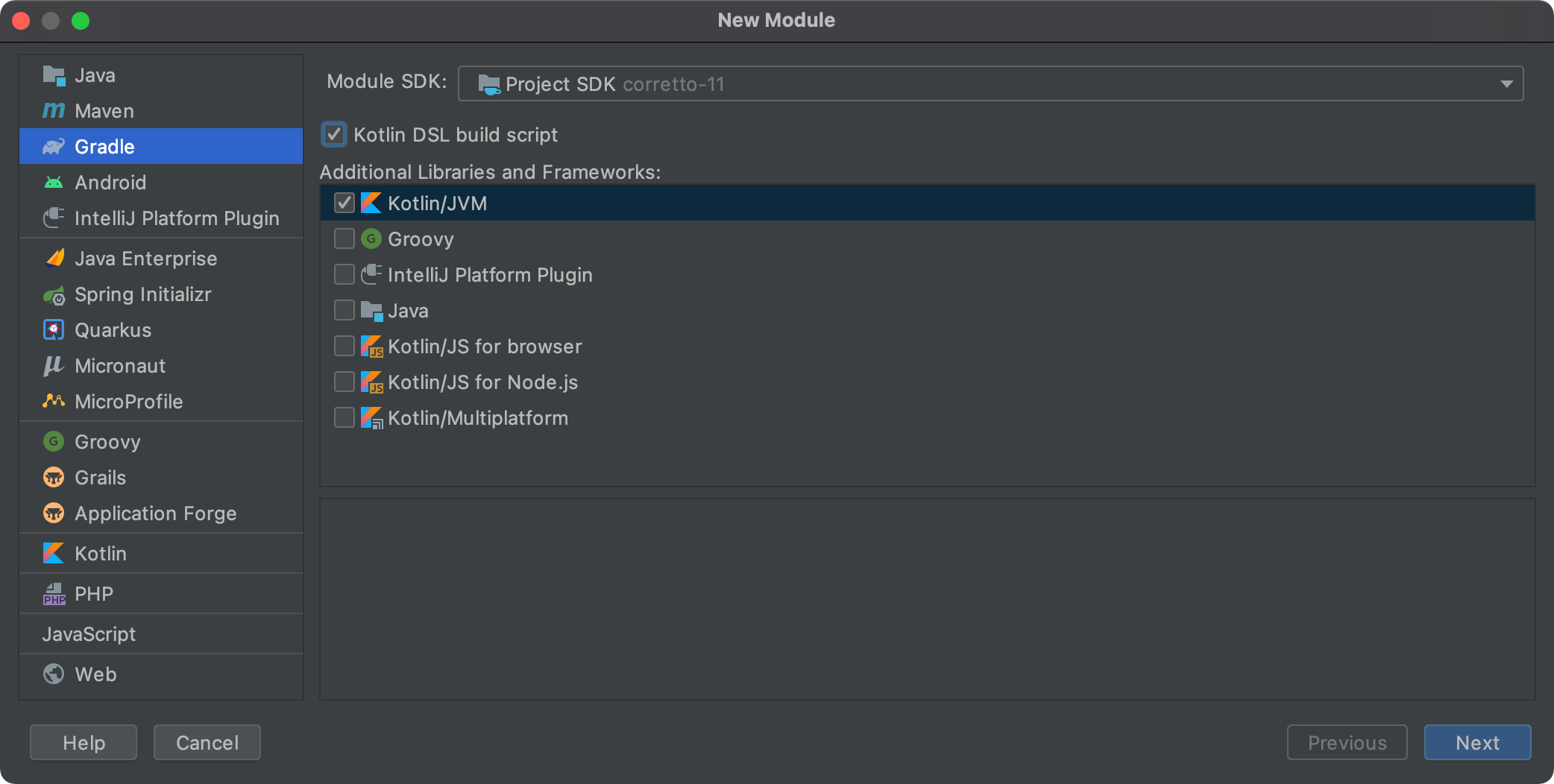 디폴트로 체크되어 있는 Java는 체크 해제를 하고, Kotlin/JVM 으로 선택한다.