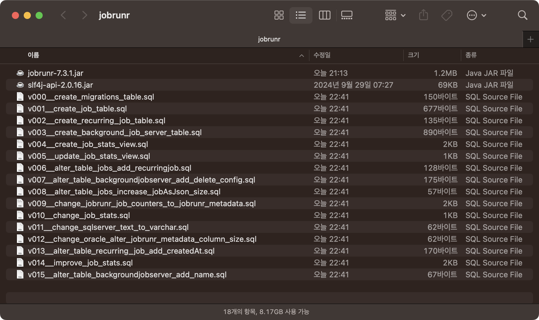 또한 database 생성 및 업데이트가 켜져있는 것이 기본값인데 애플리케이션은 CRUD 정도의 권한만 가지고 table 생성, 수정, 삭제 권한은 주지 않기 때문에 수동으로 관리를 위해 org.jobrunr.database.skip-create는 true로 동작하지 않도록 설정을 했다.