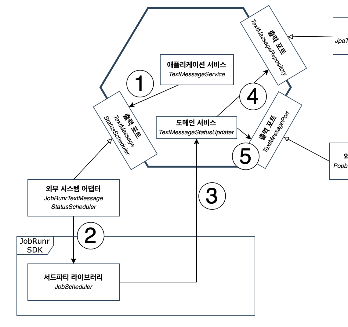 1. 애플리케이션 서비스인 TextMessageService는 문자 메시지 발송 후 TextMessageStatusScheduler에 예약 메시지를 전달한다.